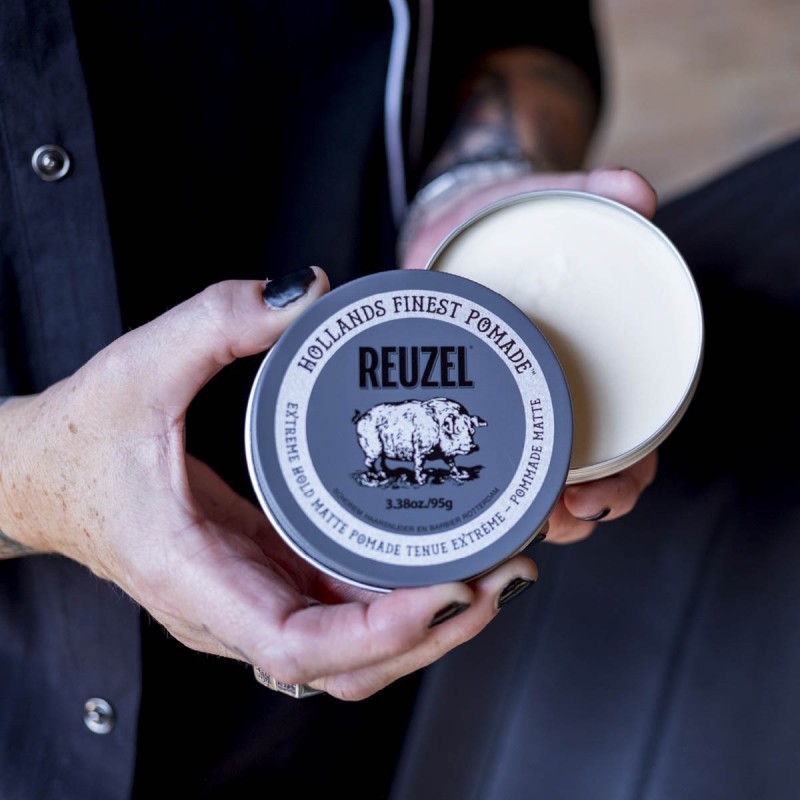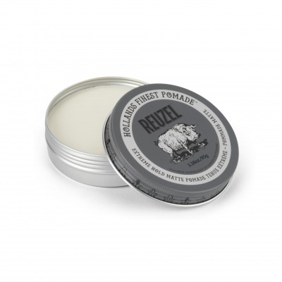 Reuzel Extreme Hold Matte Pomade (xám) là một sự lai tạo độc đáo của các thành phần Pomade gốc nước và Pomade gốc dầu nên chất sáp của sản phẩm màu trắng khá đặc nhưng lại mềm mịn dễ lấy. Khi đánh ra tay, sản phẩm tan rất nhanh và để lại khá nhiều bợn đặc trưng của các dòng pomade gốc nước không chính thống (unorthodox waterbased pomade) và khi vuốt lên tóc sáp ăn vào tóc rất nhanh, hơi rít và tạo độ độ ẩm cân bằng.